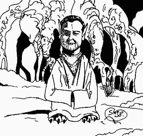 " Putain ! ! ! ". A ce moment là, mais surtout à ce mot là, le Myéki, garant des bons múurs de cette aventure se retourna vers notre héros avec la ferme intention de lui bouffer la gueule, ... au sens premier du terme. Luke sentit la menace, cette arrivée d'haleine fétide dans son cou chaud et se reconcentra. D'un geste il récupéra enfin son sabre laser et se détacha les pieds. De son côté, Myéki arrivait plein pot et le choc fut inévitable.