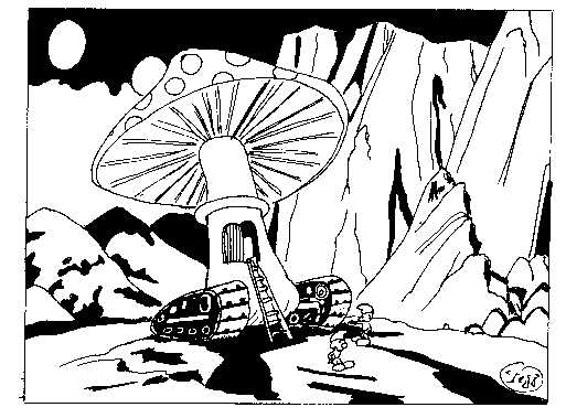 Luke sortit donc faire signe au vaisseau. Tous ses amis étaient partis et lui restait là. Le vaisseau arrivait lentement. Il ressemblait à une sorte de champignon géant tiré par deux chenilles. Les schtroumpfs se déplaçaient toujours ainsi.